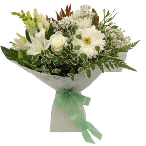 Elegant whites with a touch of freshness ๐ค๐ฟ A timeless arrangement full of soft blooms and lush greenery ,perfect handbag for any occasion.