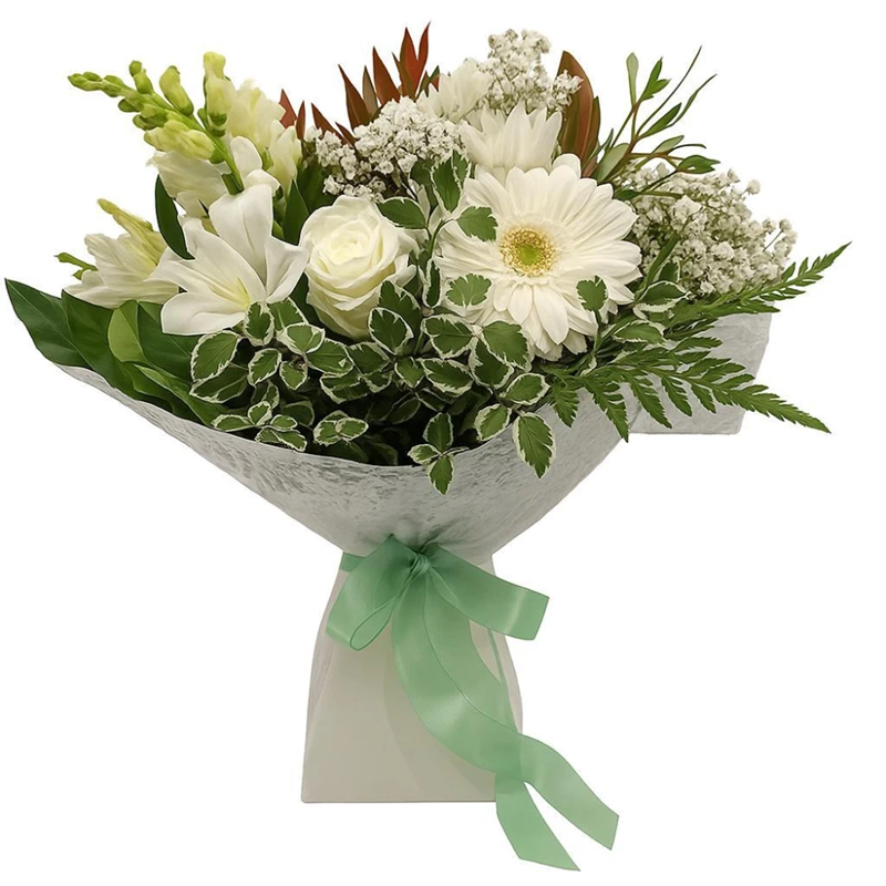 Stunning hand tied bouquet of seasonal flowers in shades of whites and creams suitable for any occasion. This design is very popular for sympathy and funerals. Seasonal flowers will vary but will always be in these colours, fresh and beautiful, with suitable foliage to frame and enhance. Flowers can include roses, lilies, gerberas, stock, snapdragons, chrysanthemums, dahlias, or other lovely blooms. Presented and delivered in a box, with no need for a vase! Box designs and colours may vary.