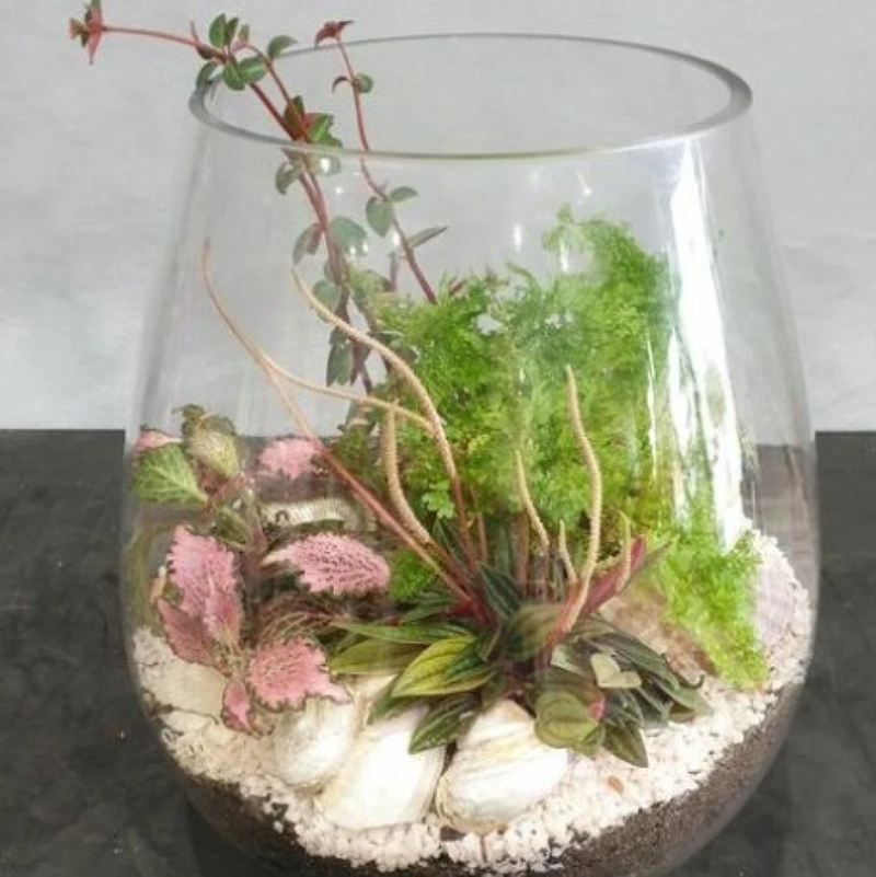 Pots vary in make, size, colours and designs. We have glass, ceramic, cement pots in standard shapes and other more unusual shapes like elephants, llamas, animals, faces, hanging glass terrariums and unusual vases. Varying sizes and types are available. Photo is an example of one of our larger terrariums.