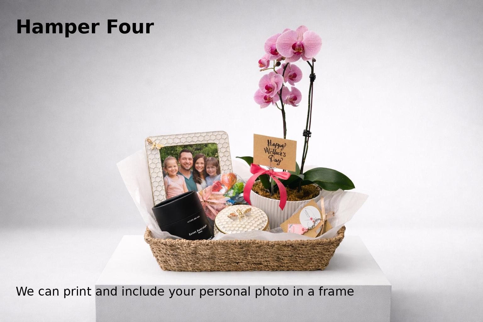 the hamper will be send in a beautiful seagrass tray . orchid plant color might be different according to store availability.
