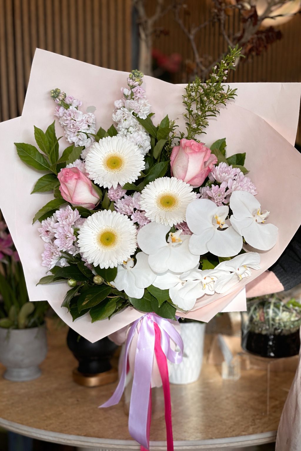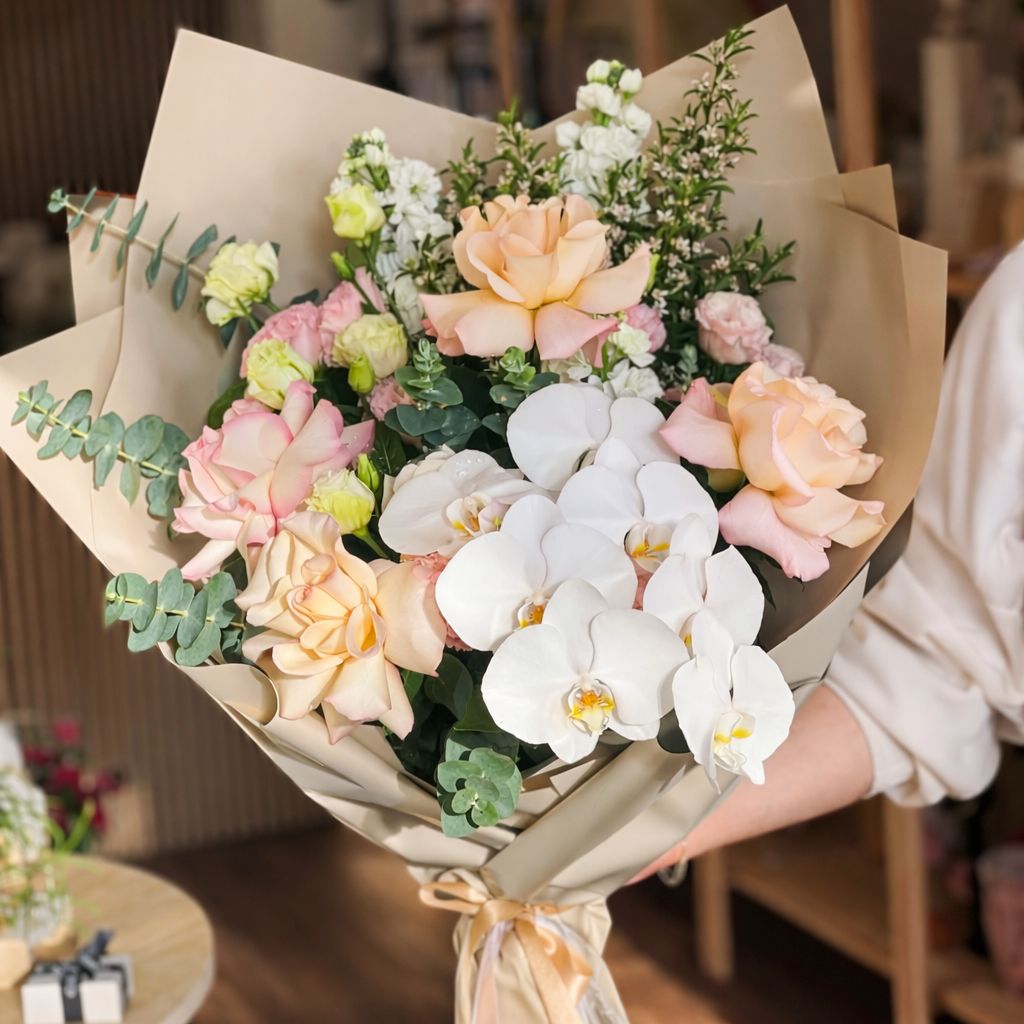 An elegant statement bouquet full of pastel, lush textures, and seasonal blooms , including roses, orchids, chrysanthemums, and other premium varieties.