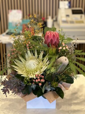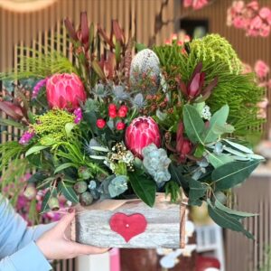 A beautiful hat-box filled with a vibrant collection of flowers and foliage.